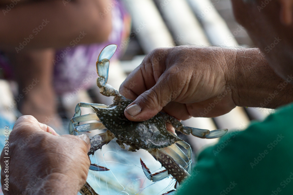 Soft focus of Fisherman hands take Blue swimming crab off fishing nets, Thailand