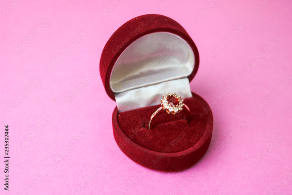A beautiful red festive gift box velvet for an engagement ring with a red precious dagotsennym stone, brilliant ruby. Concept: marriage proposal