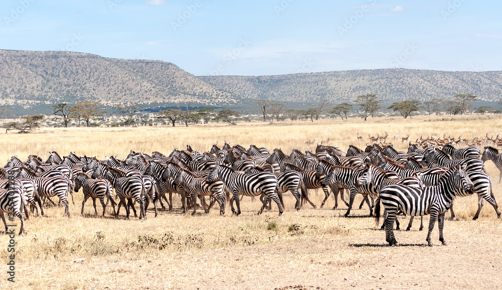 Zebras and wildebeest crossing the Serengeti in