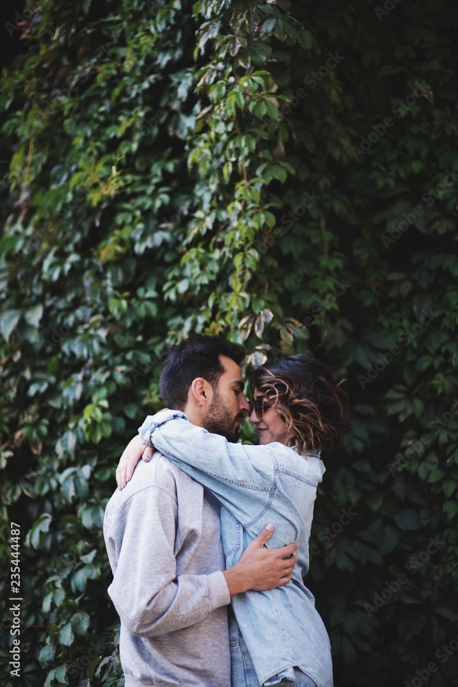 Cute couple hugging and kissing against the background of the green leaf wall.