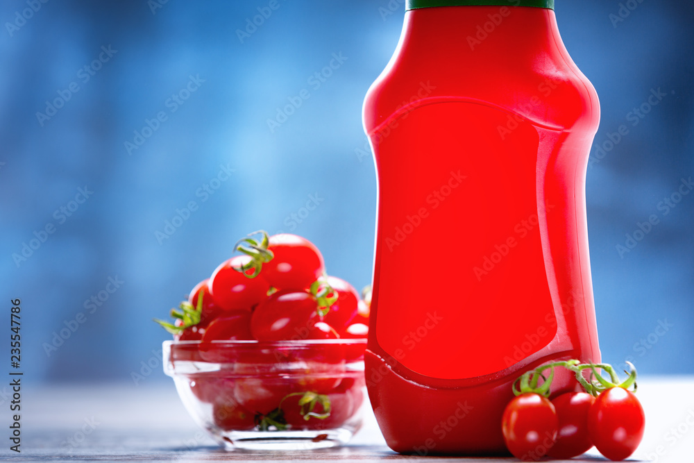 Ketchup mock up. Close up of a red ketchup package next to fresh organic cherry tomatoes.