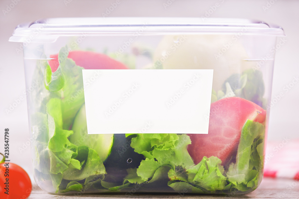 Organic salad inside plastic package. Fresh and tasty salad mock up.