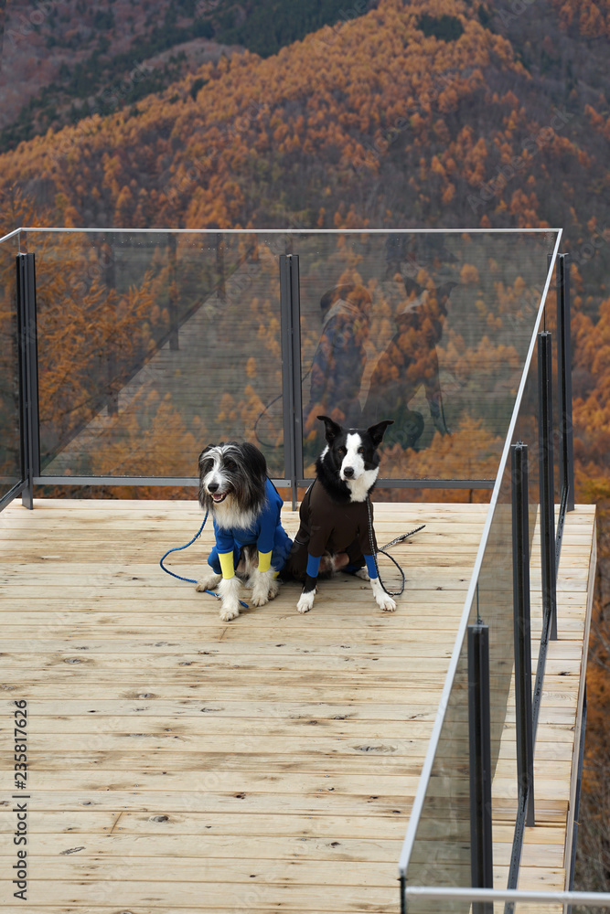 Black and white border collie sheep dog and Briquet Griffon Vendeen dog wearing full black color body suit standing on timber deck