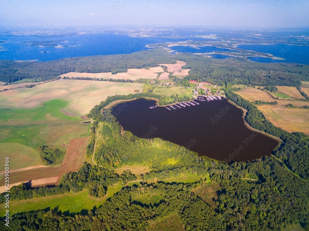 Aerial view of Sztynorckie Lake and yachts moored in marina in Sztynort, Mazury, Poland (former Steinort, East Prussia)