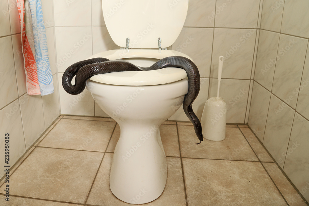 eine schwarze Schlange kriecht aus der Toilette heraus in eine Wohnung