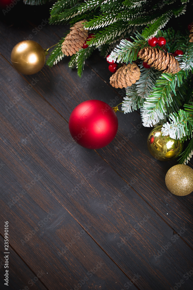 Christmas background with fir tree green branches, greeting card with decoration in red and golden colors on dark brown wooden board, copy space banner