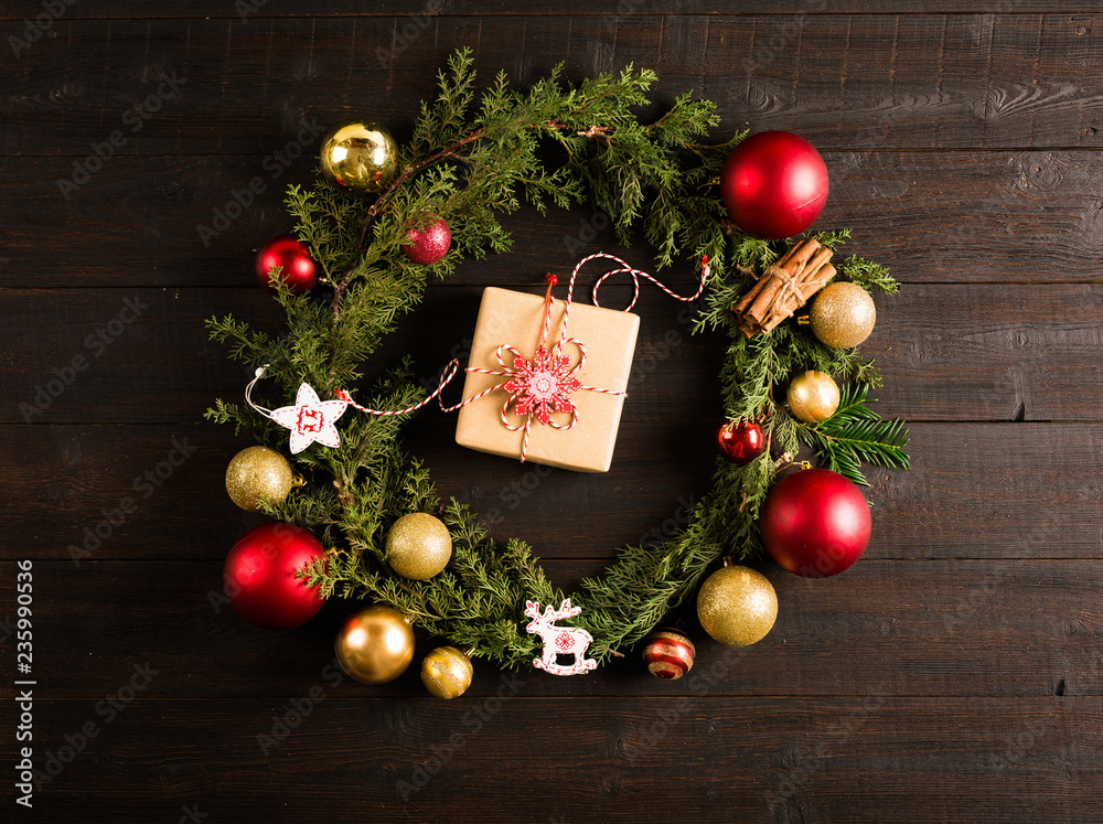 Christmas wreath made of green fir branches on dark brown wooden background table or door with red and golden Christmas baubles ornaments, copy space in center frame and empty mock up for text
