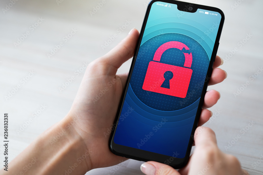Security breach unlock padlock icon on mobile phone screen. Cyber protection concept.