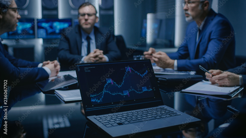 On the Table Laptop Showing Statistics: Team of Politicians, Corporate Business Leaders and Lawyers Sitting at the Negotiations Table in the Conference Room, Trying to Come to an Agreement.