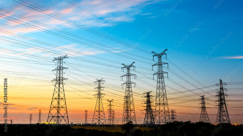 high-voltage power lines at sunset,high voltage electric transmission tower
