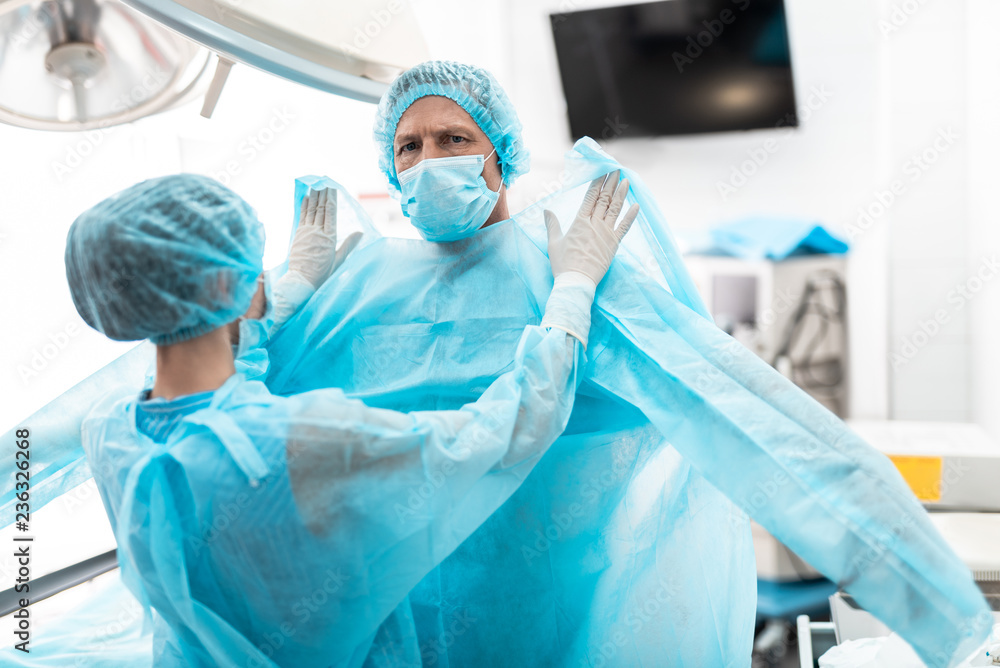 Portrait of nurse in sterile gloves putting on blue surgical gown on surgeon. Middle aged man looking at camera with serious expression