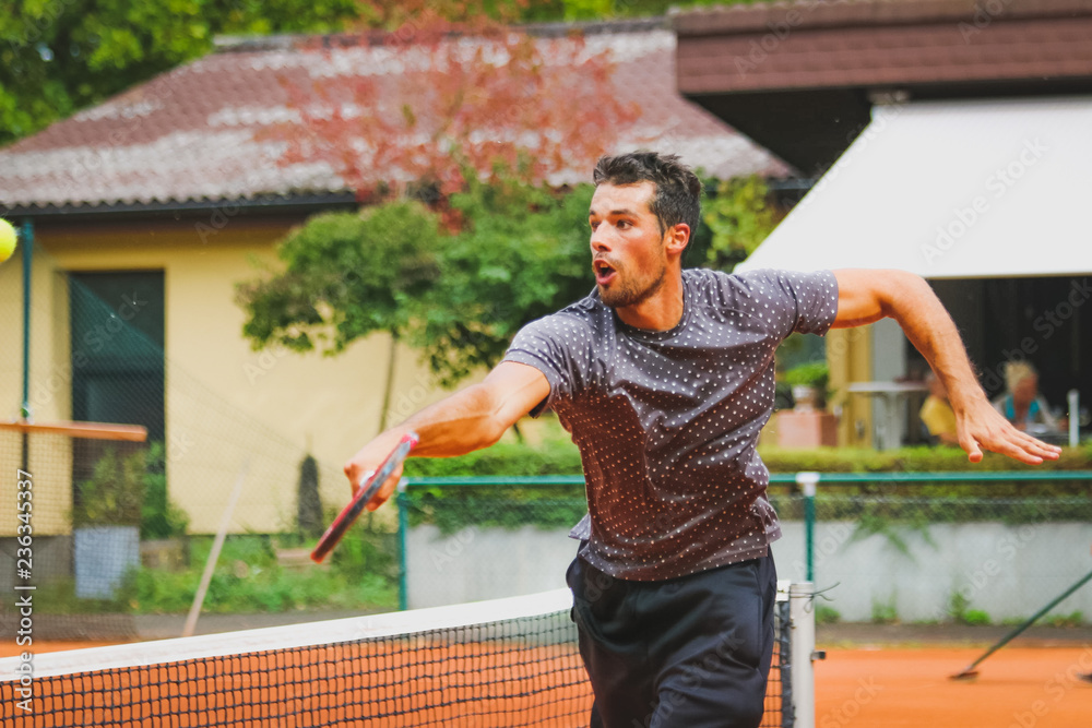 Junger Tennisspieler streckt sich um einen Rückhandvolley zu spielen