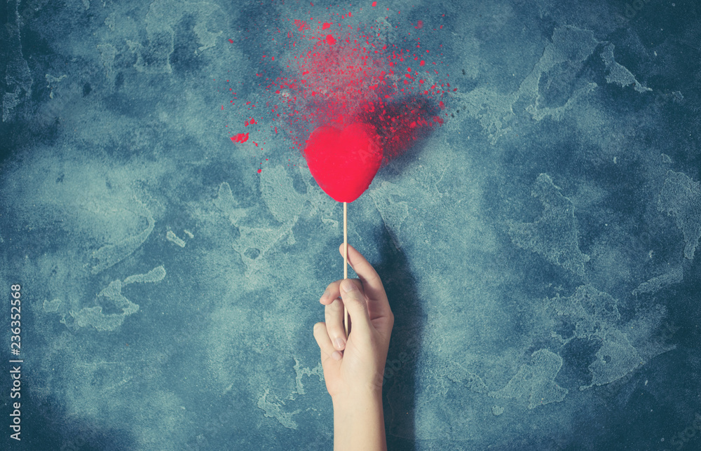 Concept of broken heart. Hand holding little figure of a heart with dispersion effect