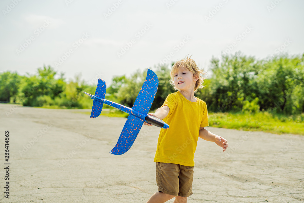 Happy kid playing with toy airplane against old runway background. Traveling with kids concept