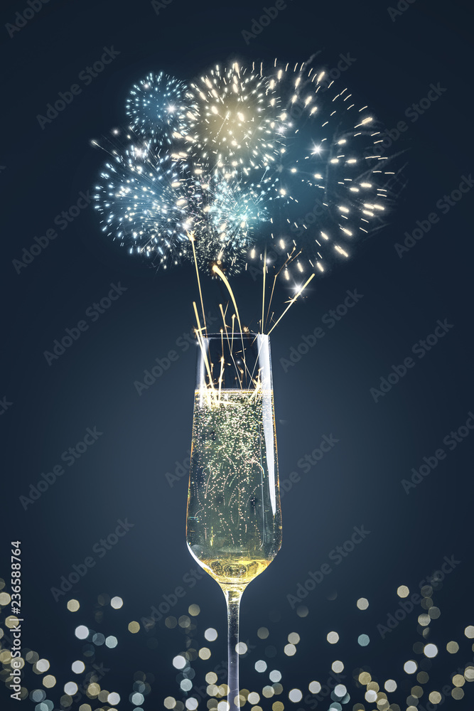 Sektglas mit Feuerwerk und Bokeh