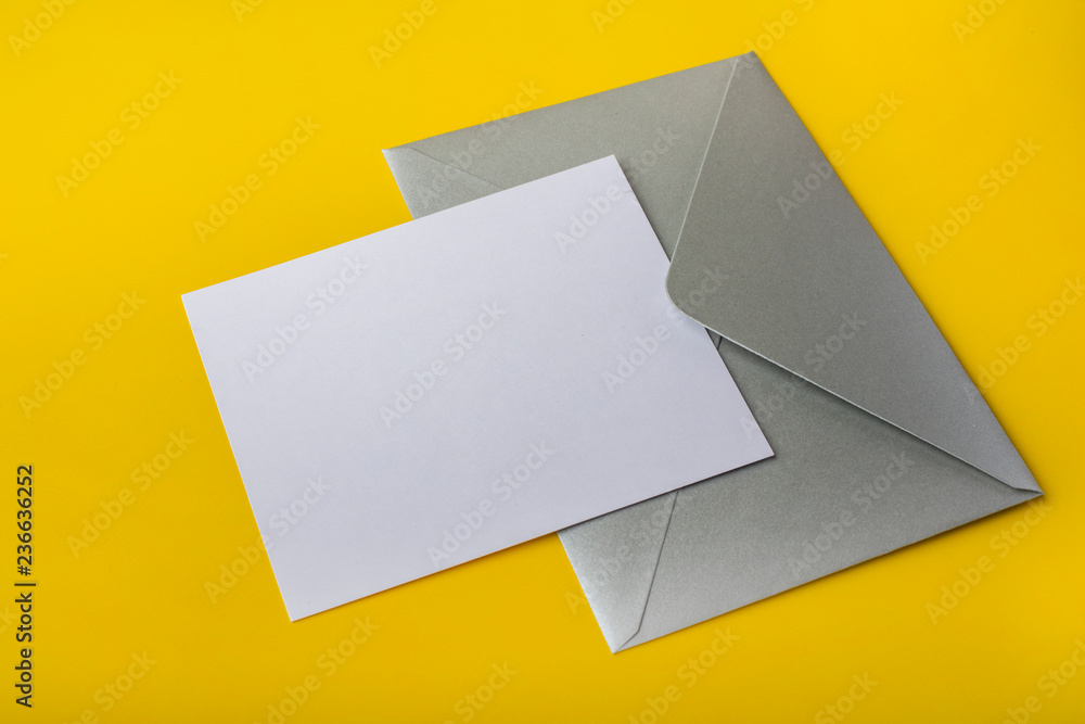 Mock-up letter or card with a silver envelope on a yellow background. Copy space