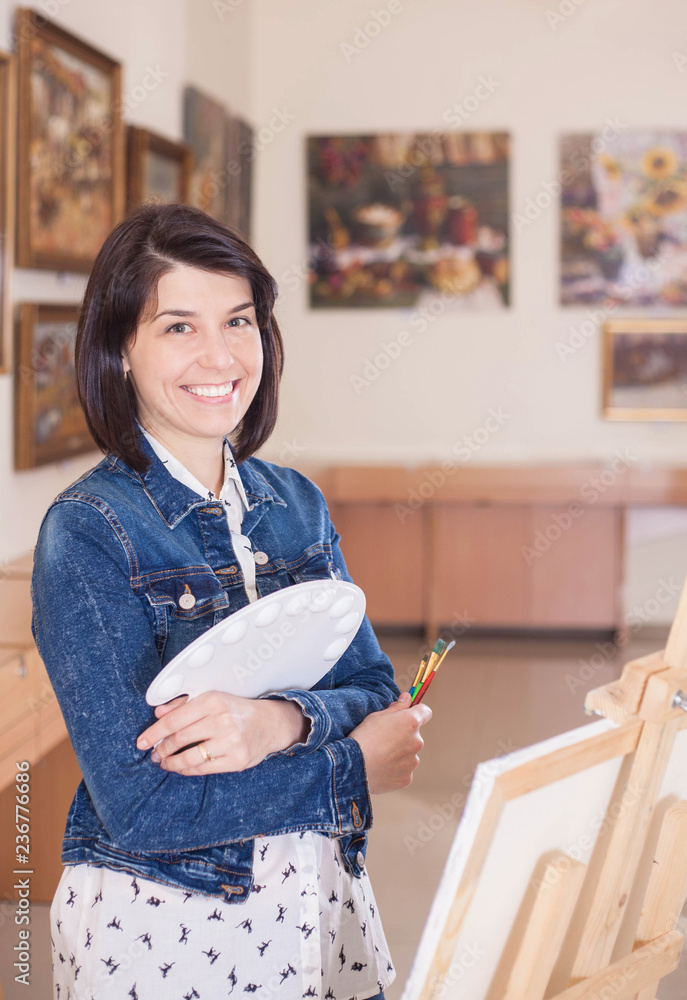 Cute young woman painting a picture near an easel in a studio.