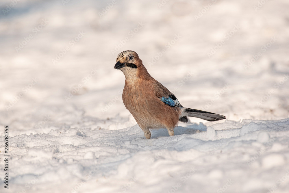 Portrait of standing Eurasian Jay - Garrulus glandarius. Bird in the crow family