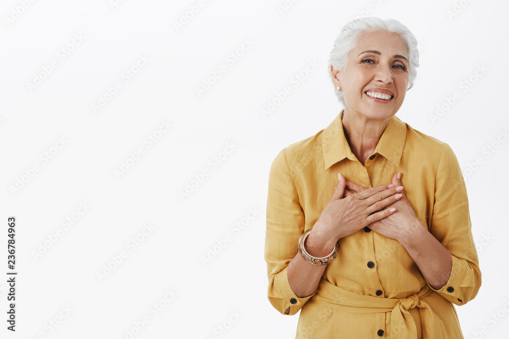 Senior woman keep getting compliments looking fresh and beautiful. Delighted happy charming old lady with white hair in stylish yellow coat holding palms on heart thankfully smiling at camera