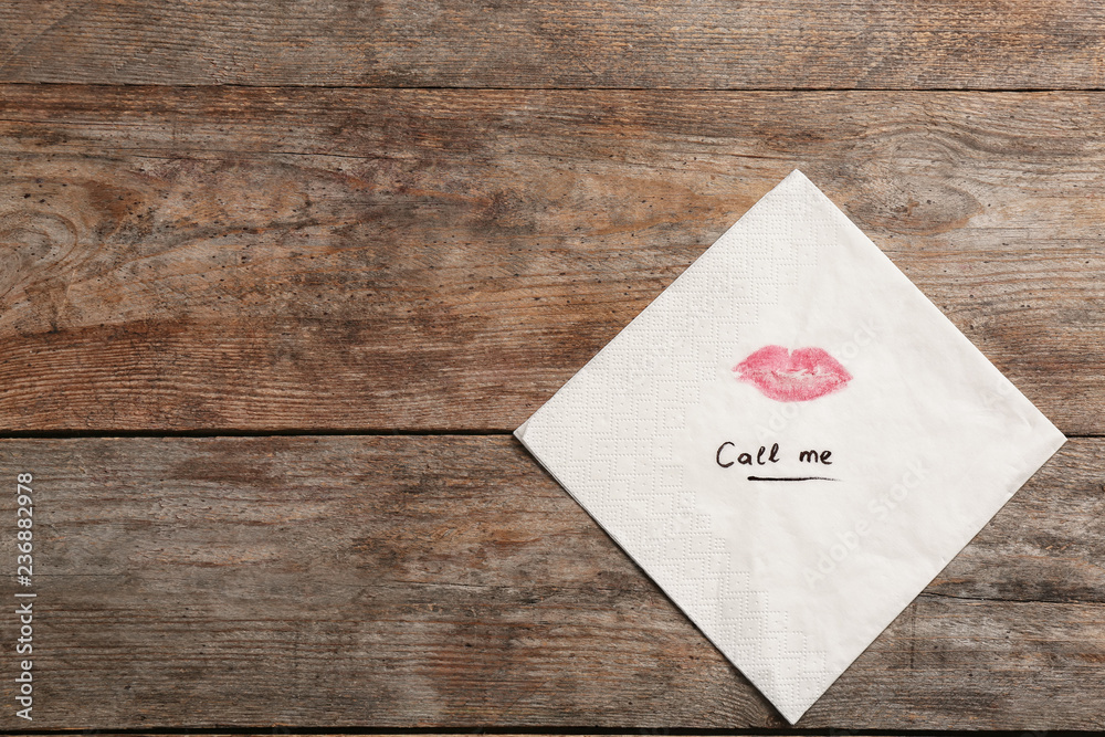 Paper napkin with lipstick mark and words CALL ME on wooden background, top view. Space for text