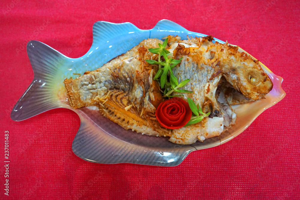 Delicious deep fried fish with mushroom herb chillies dipping sauce in a white bowl and red background