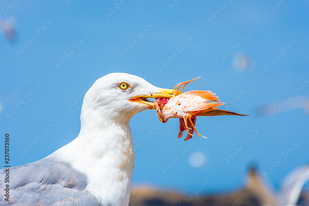 Seagull eating its seafood in the beach of Essaouira, Morocco