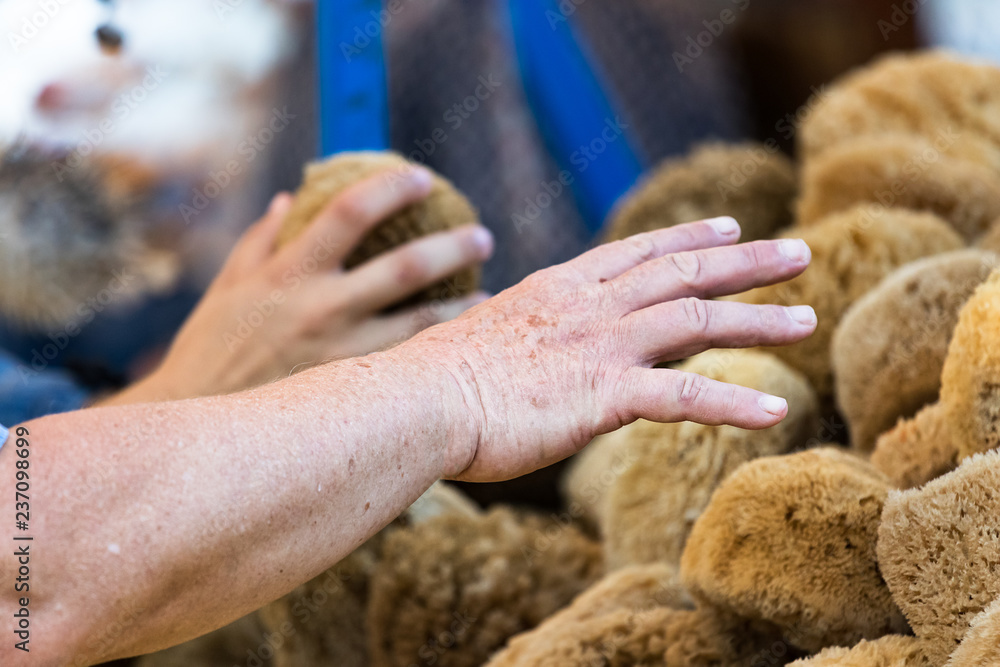 A woman hand choosing natural sponges at a street market in Rhodes, Greece.