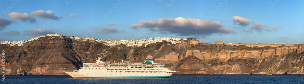 Panoramic view of the city of Thira and a cruise ship in Santorini, Geece.