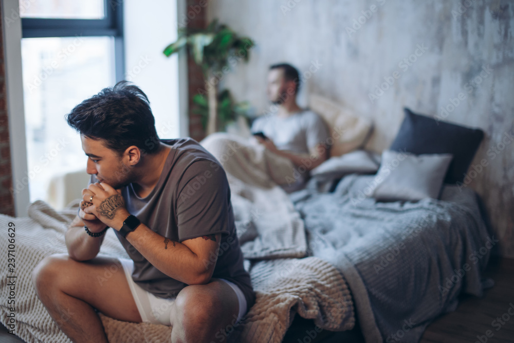 Same sex relationship problems. Close up of dark-haired handsome guy looking away with unhappy expression and touching his chin. His boyfriend sitting behind on the bed with blurred background