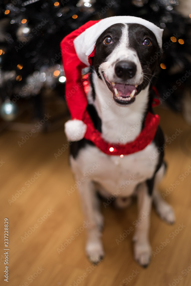 Black & White Lurcher Dog, wearing a santa hat, sat by a Christmas Tree, with blurred background
