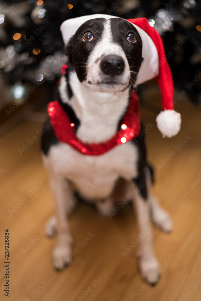 Black & White Lurcher Dog, wearing a santa hat, sat by a Christmas Tree, with blurred background