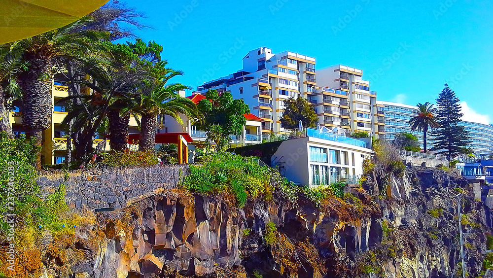 Coastal rocky line of hotels in Funchal, the mountains. Madeira, Portugal