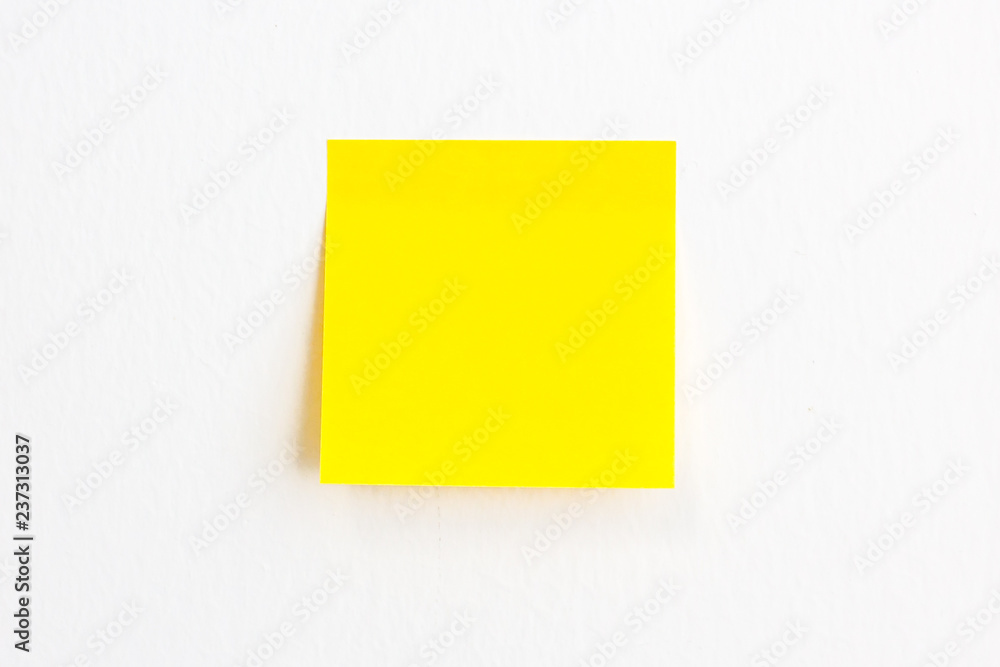 Yellow post it paper note on a white wall background with empty space.