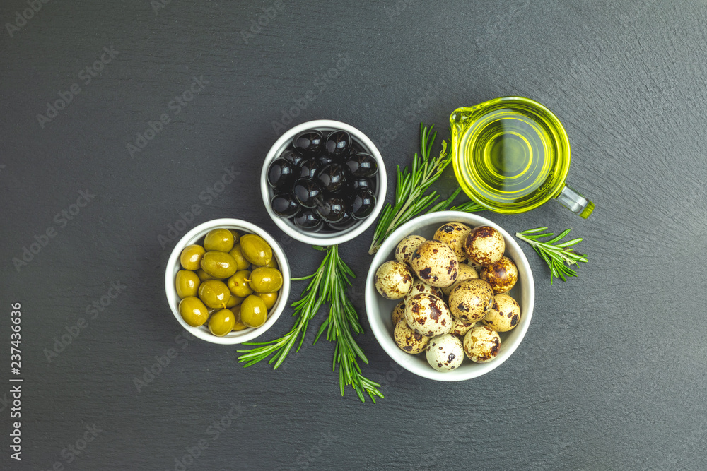 Set of black and green olives, quail eggs on plates, olive oil and rosemary