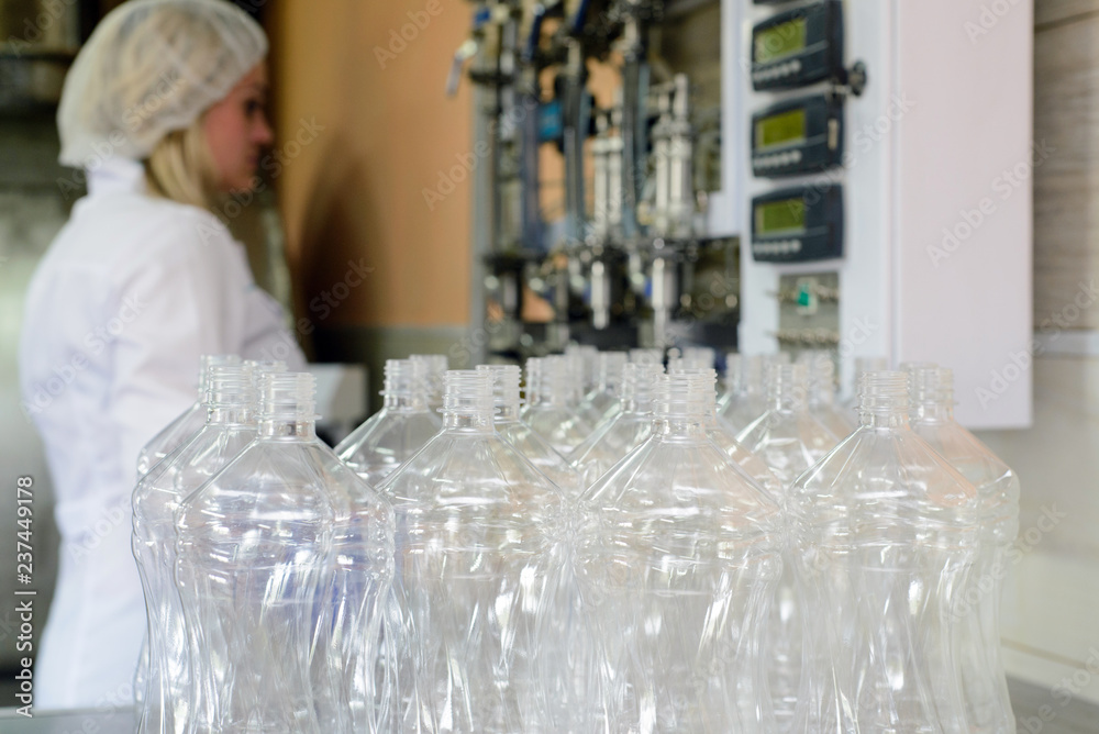 line of production of refined sunflower oil. Girl worker at a factory on a conveyor background with bottles of vegetable oil.
