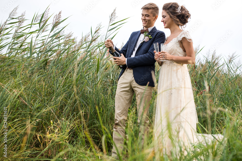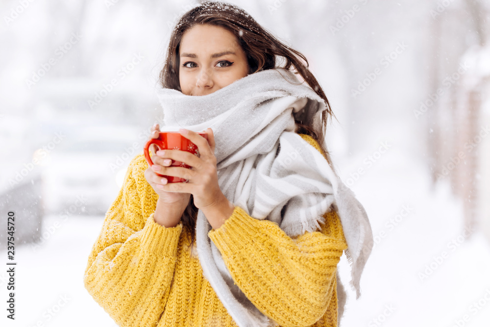 Nice dark-haired girl in a yellow sweater and a white scarf standing with a red mug on a snowy street on a winter day