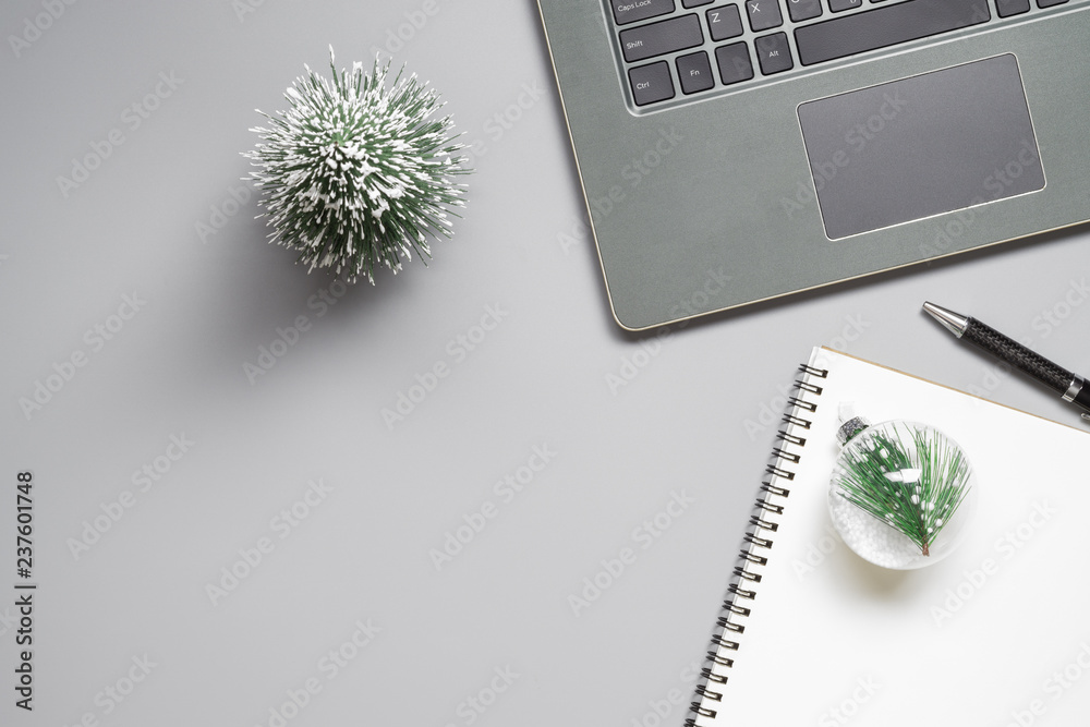 Merry Christmas and Happy new years office work space desktop concept. Flat lay top view with laptop notebook and Christmas ornaments with copy space.