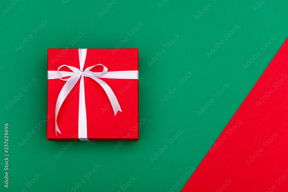 Top view of red gift box with white ribbon on green background