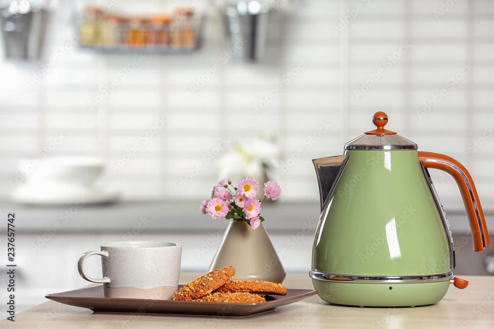 Stylish electrical kettle, cup and cookies on table against blurred room interior. Space for text