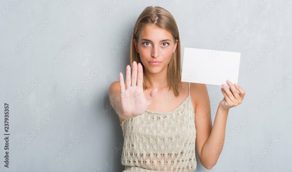 Beautiful young woman over grunge grey wall holding blank card with open hand doing stop sign with serious and confident expression, defense gesture
