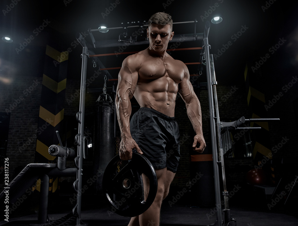 Muscular man working out in gym doing exercises, strong male naked torso abs.
