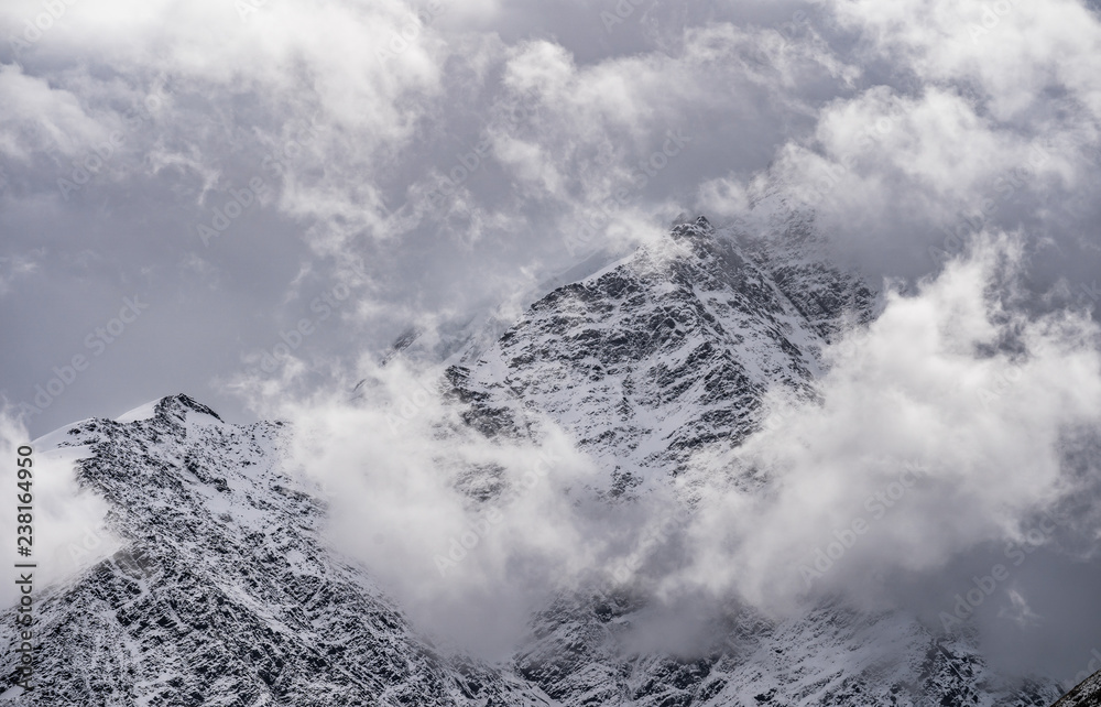 Snow covered Greater Caucasus mountains at winter sunny day. View from Elbrus slope, Kabardino-Balkaria, Russia