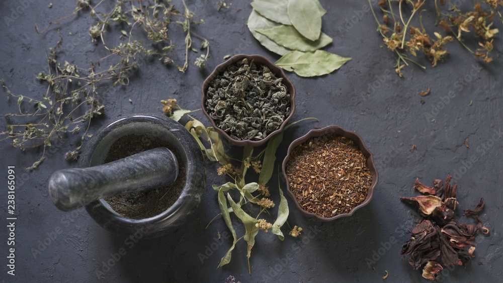 Herbal medicine preparation with fresh herbs and flowers, aromatherapy essential oil, mortar with pestle and scissors on hemp paper background.