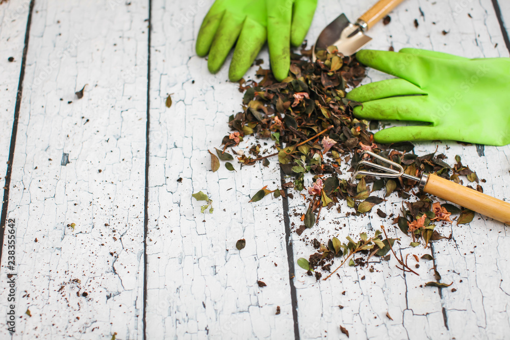 Rubber green safety gloves hand shovel and gardening rake on wooden board agriculture concept.