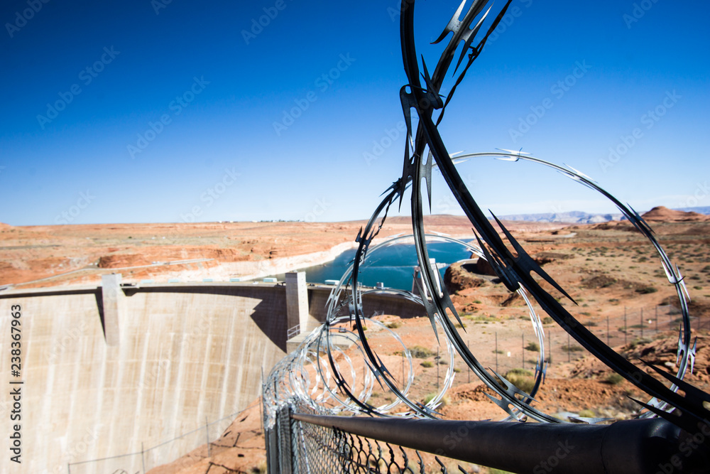 Glen Canyon Dam and Lake Powell with protective and deterrent barbed wire fence around the property