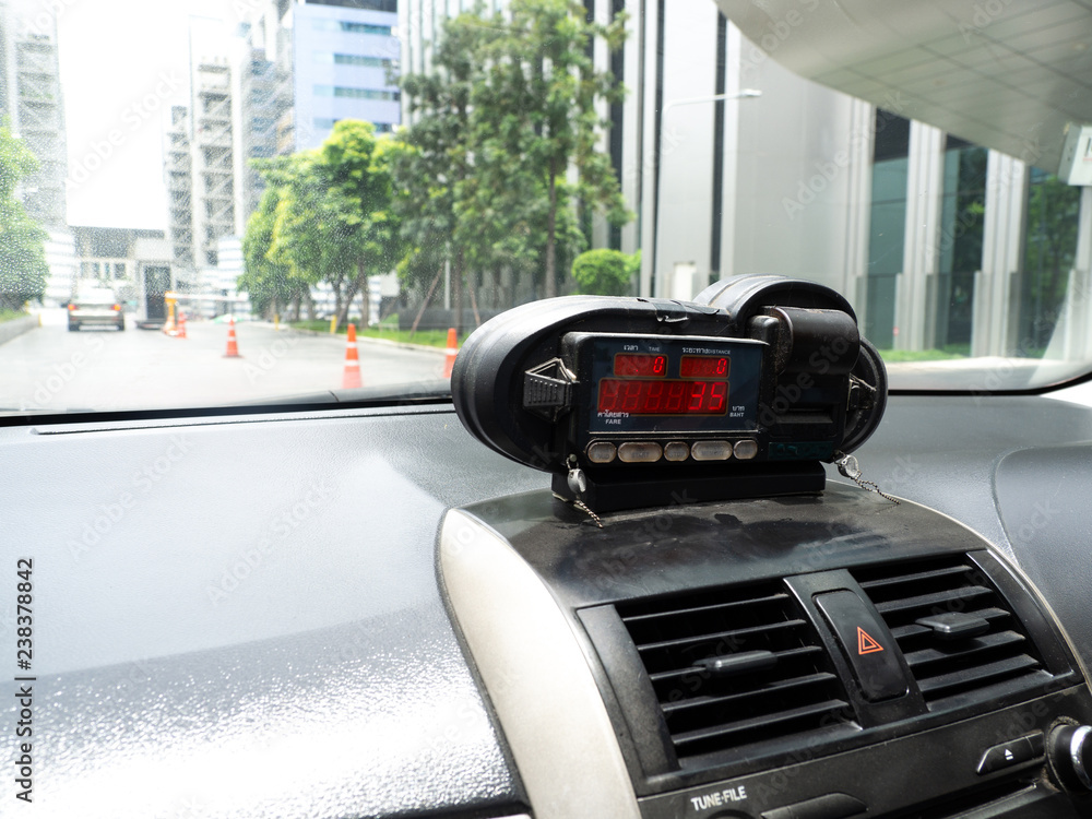 View from cab with meter display Time, Distance and Fare in dashboard interior