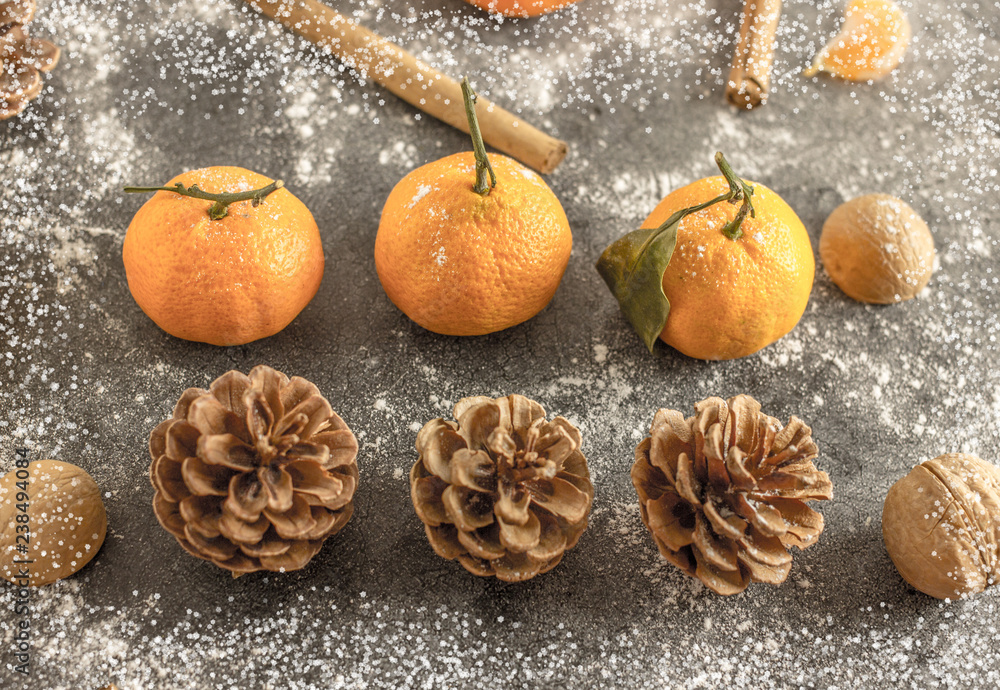 Christmas background with tangerines, pine cones, nuts, snow, and cinnamon sticks