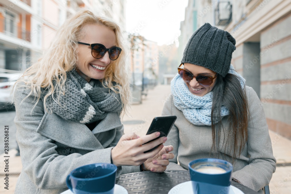Two young smiling fashionable women having fun in outdoor cafe. Urban background, women laughing looking at mobile phone