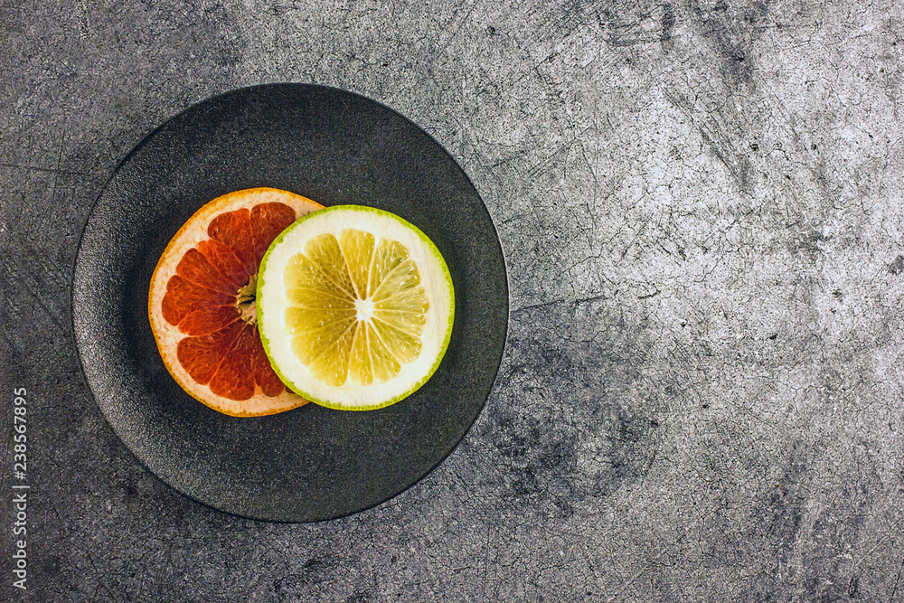 Rings of grapefruit and pomelo on a black plate. Background with citrus. Background with grapefruit