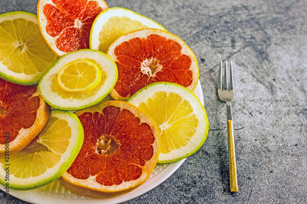 Rings of grapefruit and pomelo on a plate of different colors, next to a fork. Background with citrus. Background with grapefruit